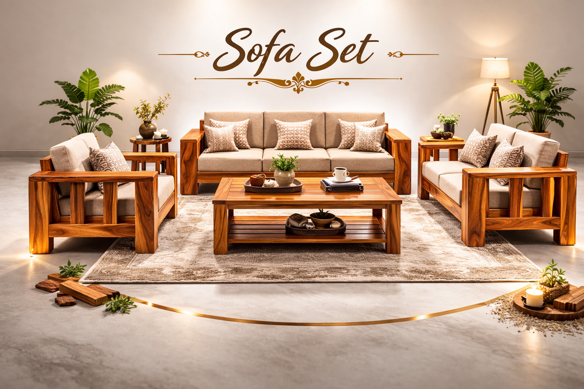 Modern Wooden Sofa Set with Cushions & Center Table | 3+2+1 Living Room