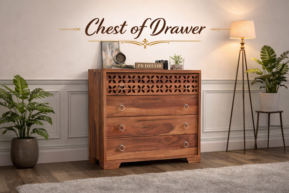 Modern Wooden Chest of Drawers with Carved Front Panel | 4 Drawer Storage