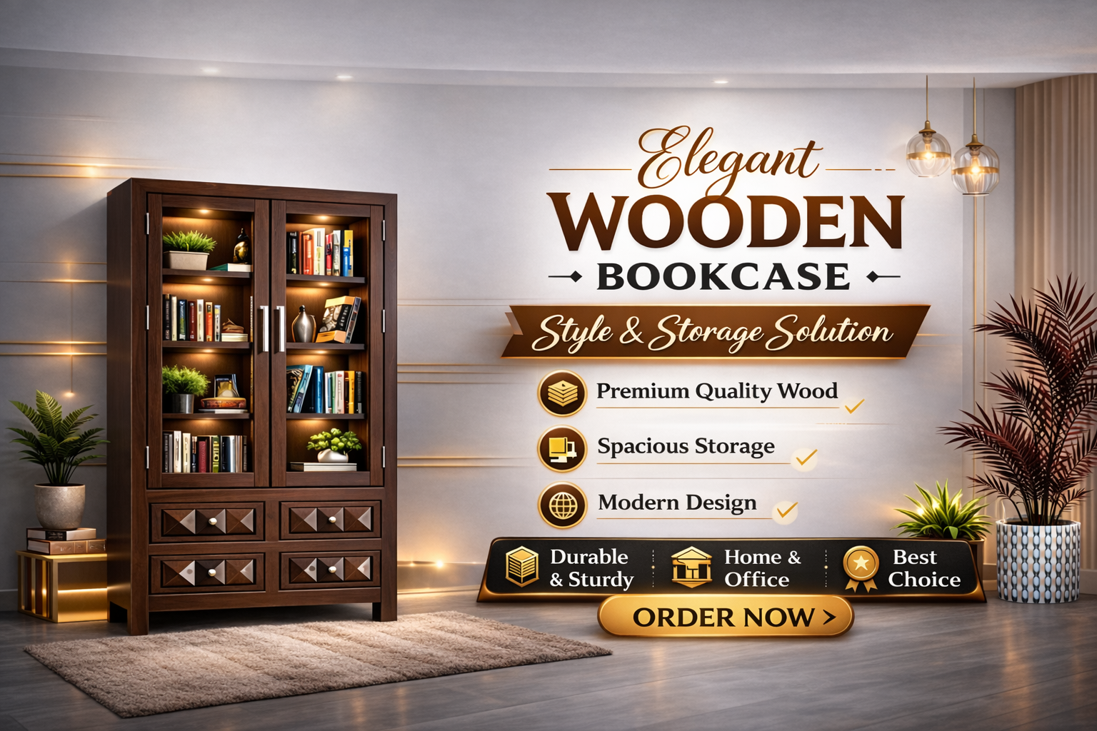 Modern Wooden Glass Door Bookcase Cabinet with Drawers