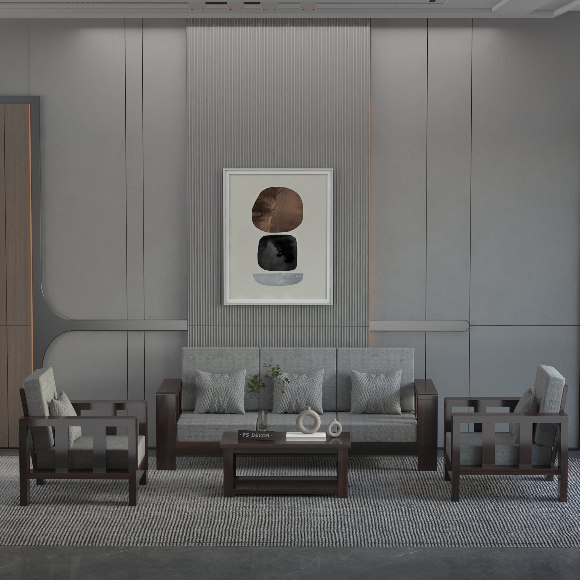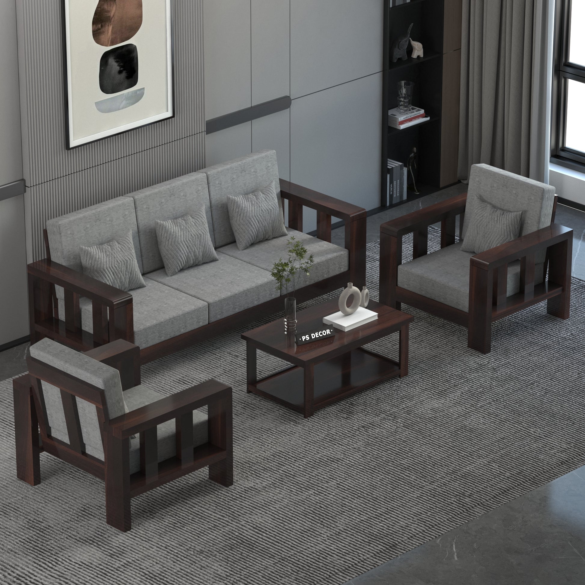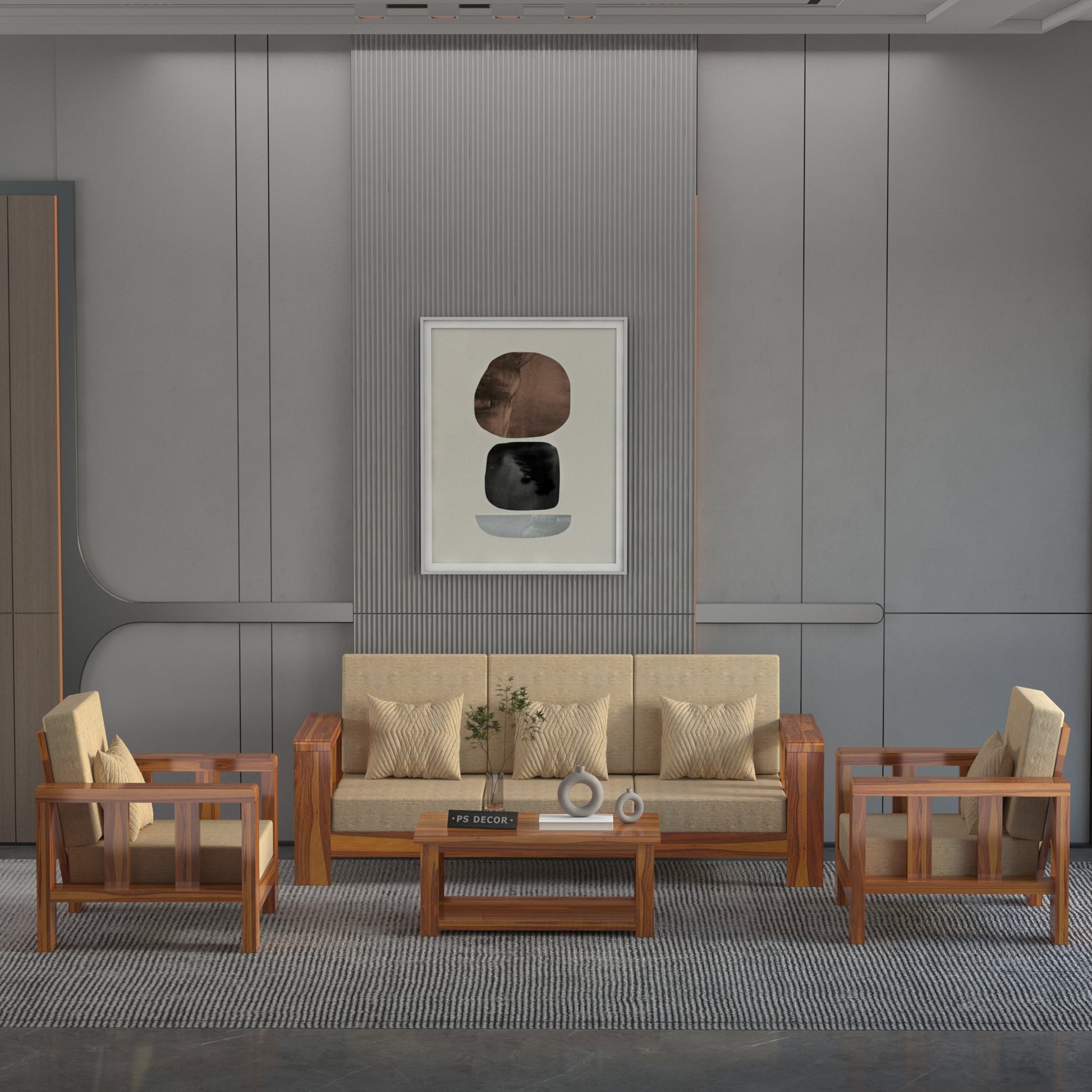 This Modern Wooden Sofa Set is a perfect blend of comfort, durability, and contemporary design, making it an ideal choice for living rooms, lounges, and office waiting areas. The set includes a spacious 3-seater sofa, two single chairs, and a matching center table, offering a complete seating solution for your space.