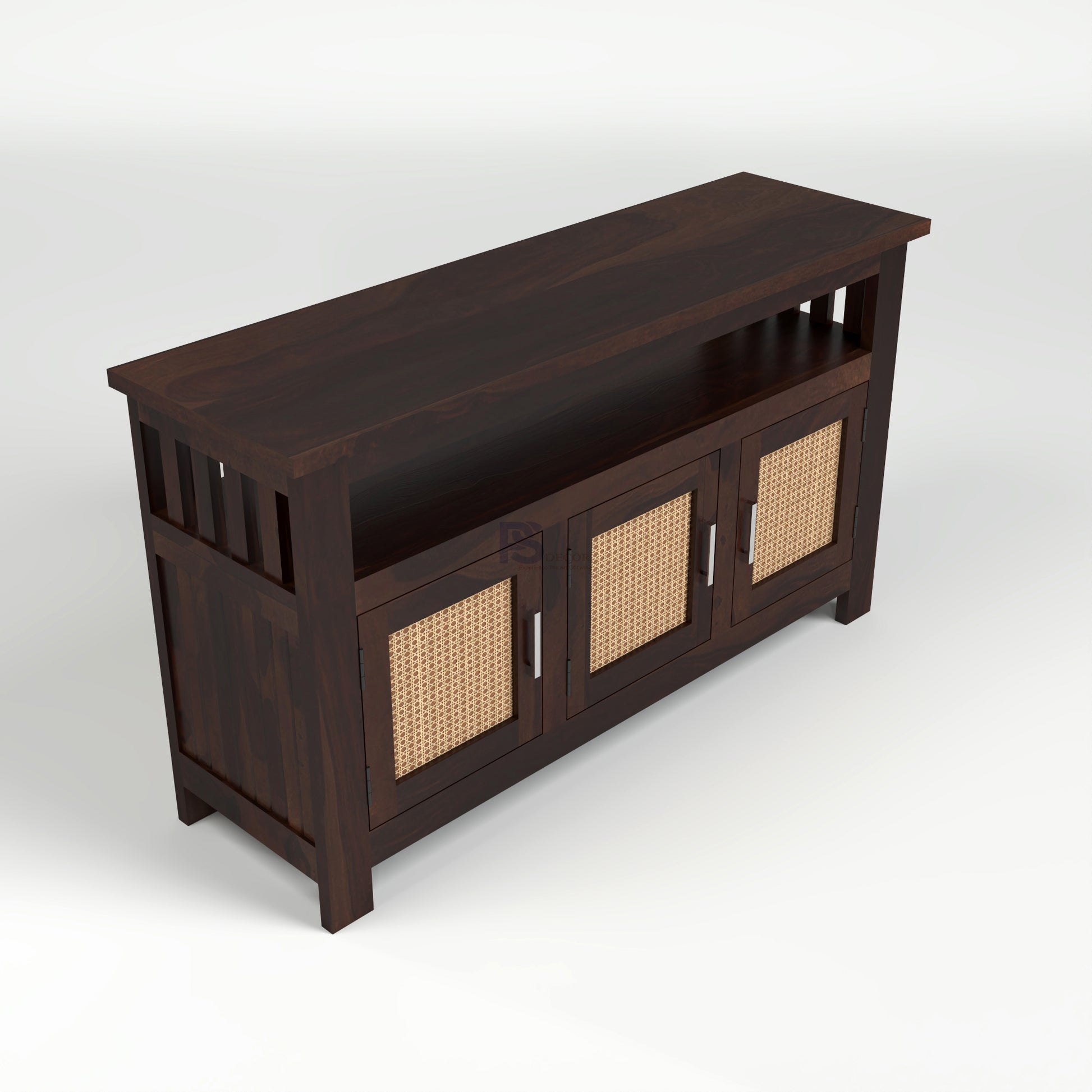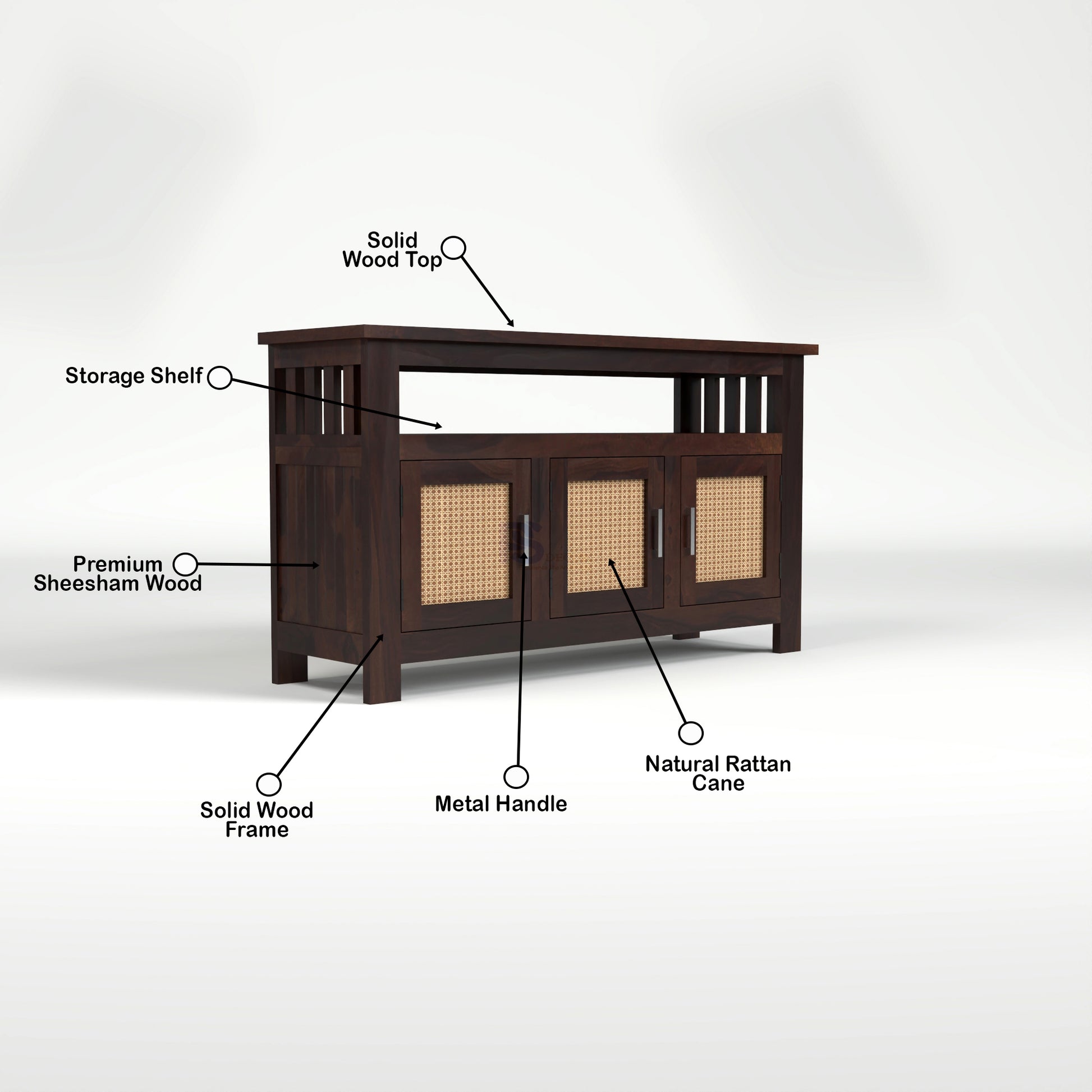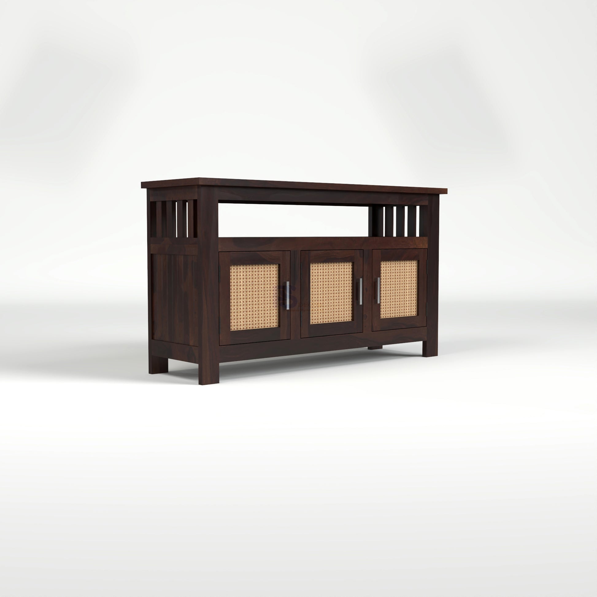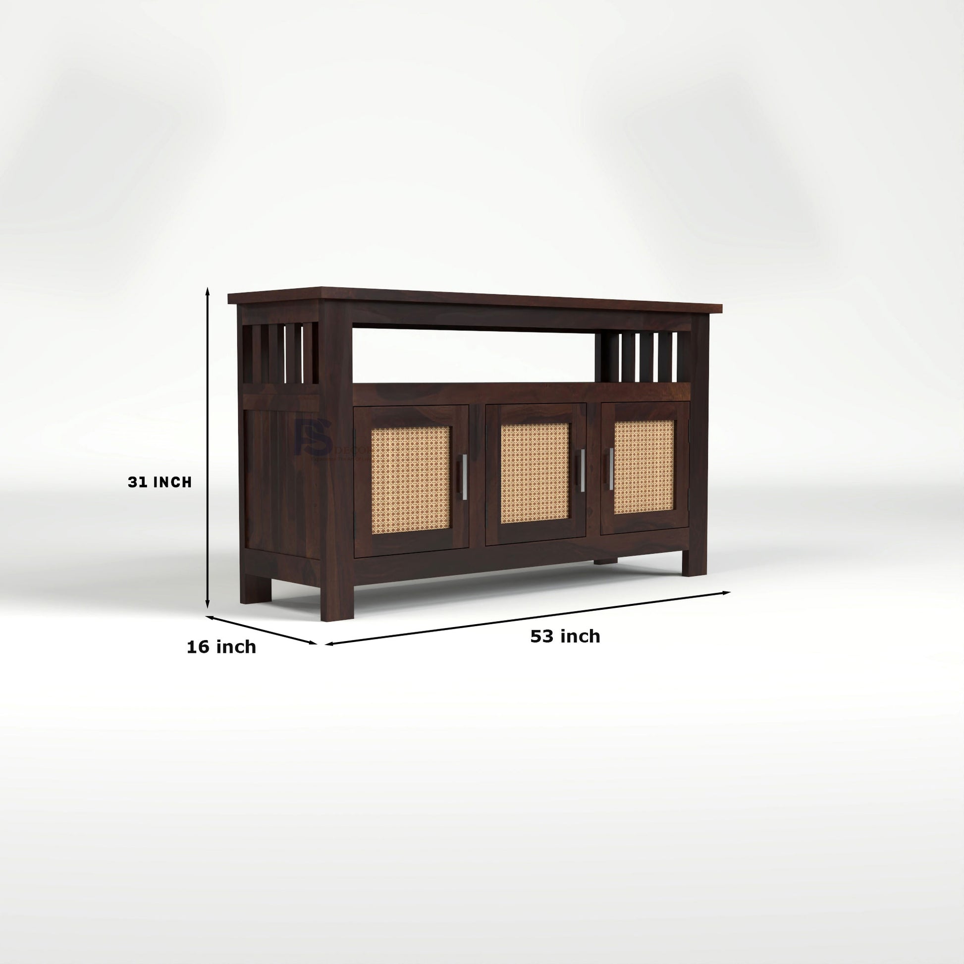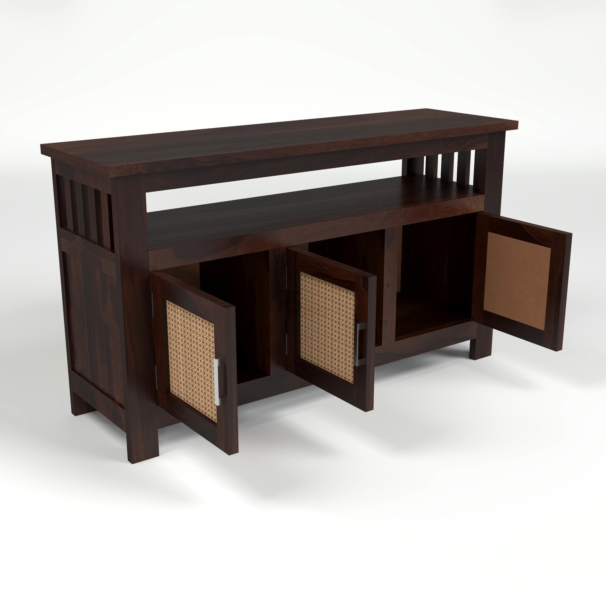 This Wooden Sideboard Cabinet with cane panel doors is a stylish and functional addition to any living room, dining area, or hallway. Designed with a spacious tabletop, an open middle shelf, and three closed storage compartments, it offers ample space for storing crockery, books, décor items, and everyday essentials.